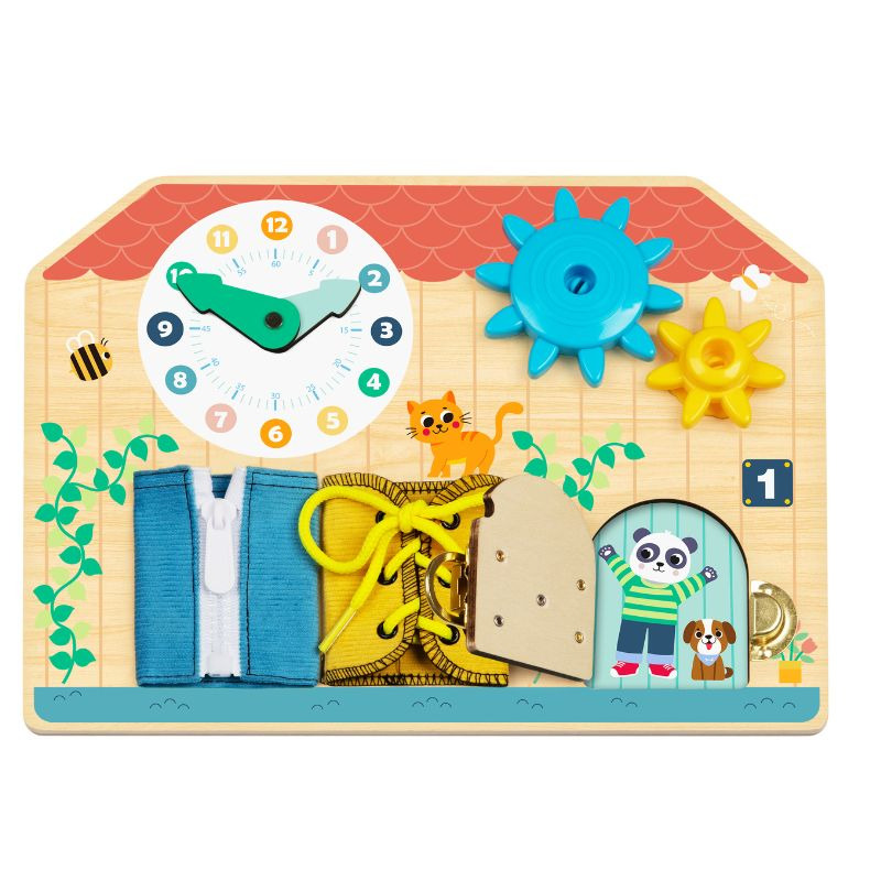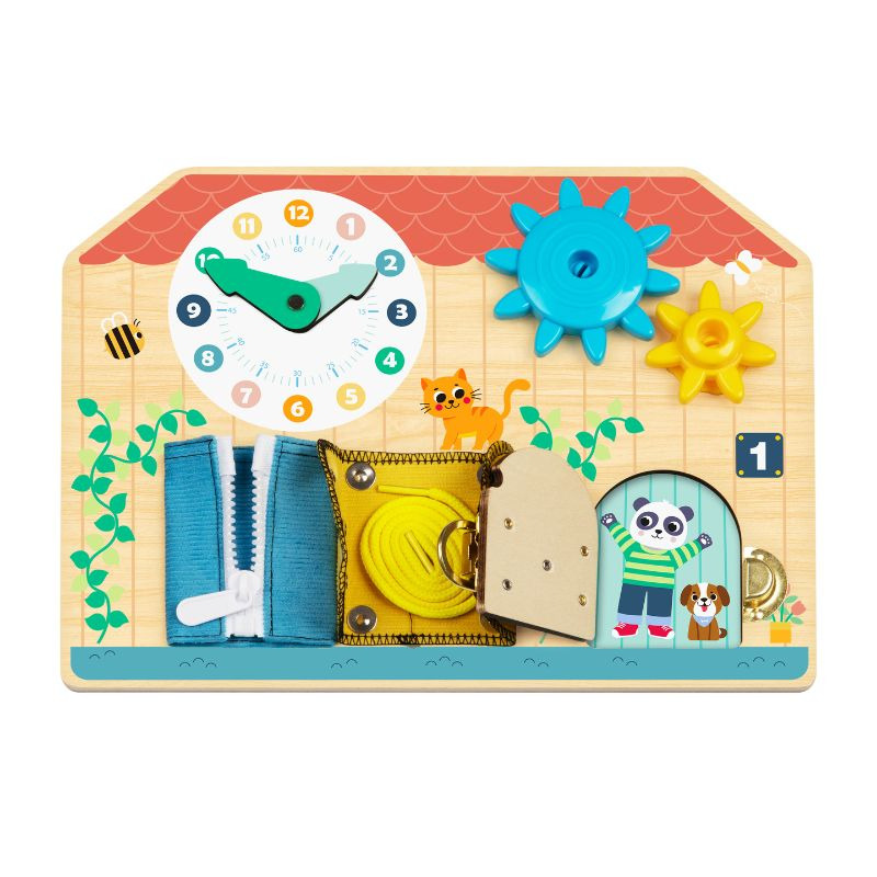 Ova šarena drvena edukativna tabla u obliku kućice osmišljena je da kroz igru podstakne razvoj fine motorike, logičkog razmišljanja i svakodnevnih veština kod dece. Sadrži različite interaktivne elemente koji mališanima pružaju zabavno, ali i korisno iskustvo učenja.