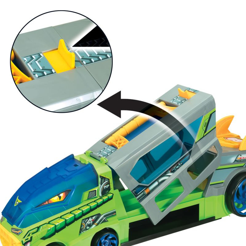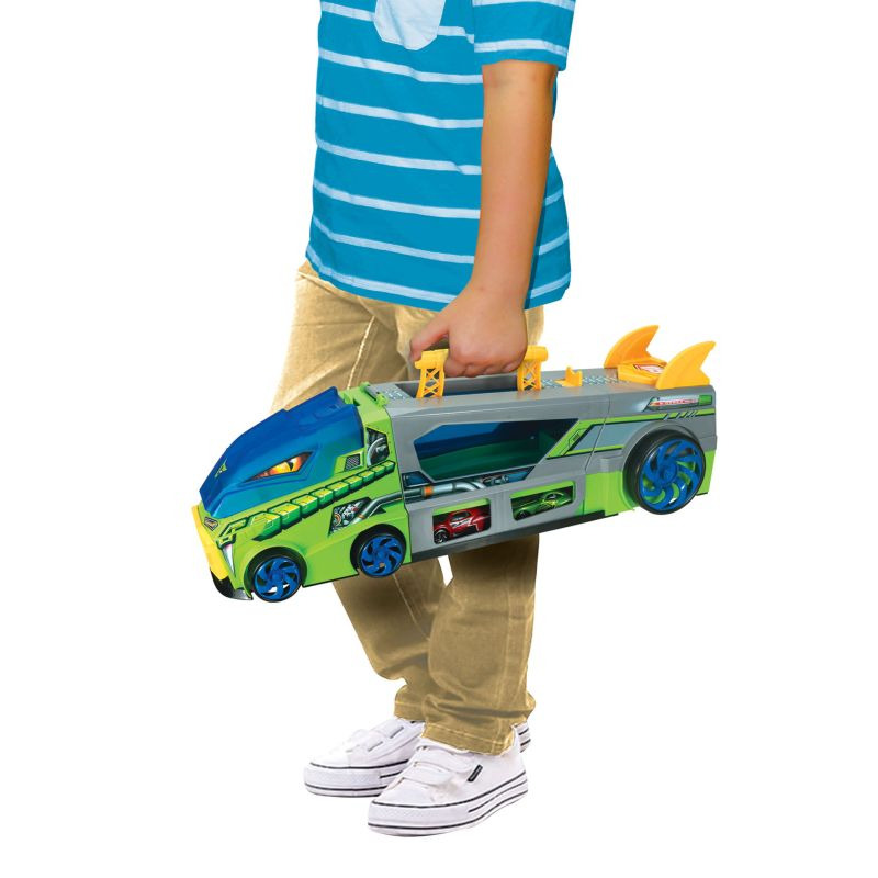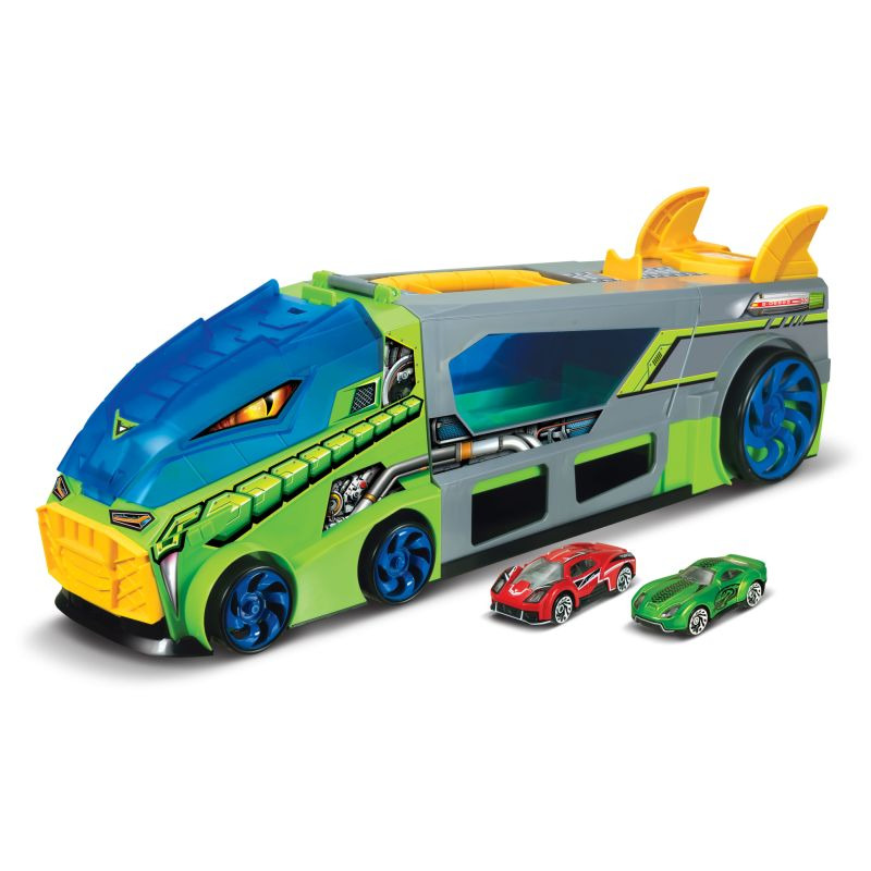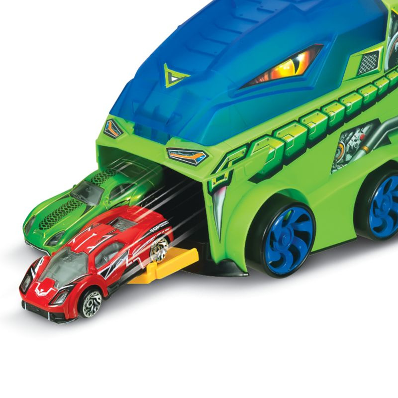 Ovaj set uključuje veliki kamion u obliku zmije sa aerodinamičnim dizajnom i 2 sportska automobila spremna za trku. Kamion služi i kao kutija za nošenje i skladištenje tvojih autića – jednostavno otvori bočnu stranu i sve stane unutra!