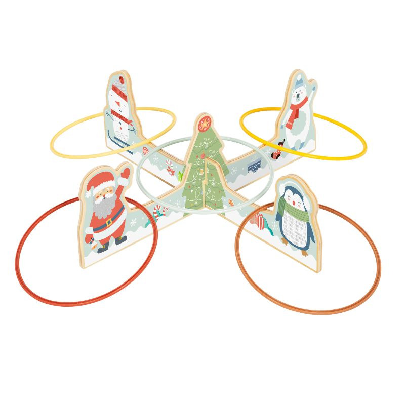 Ova vesela drvena igra sa božićnim motivima donosi mnogo zabave i aktivne igre za decu. Cilj igre je da mališani bacanjem obojenih prstenova pogode drvene figure sa simpatičnim zimskim likovima poput Deda Mraza, sneška, pingvina i medveda. Savršena je za igru u kući, ali i na otvorenom prostoru.