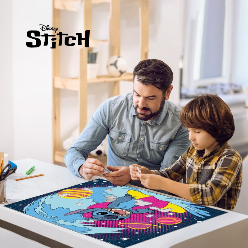 Doživi svemirsku avanturu sa najšarmantnijim vanzemaljcem – Stitch-om! Ova Prime 3D slagalica sa čak 500 delova donosi živopisnu i veselu ilustraciju Stitch-a kako surfa kroz talase u kosmičkom okruženju punom planeta i boja. Zahvaljujući posebnom 3D efektu, slika izgleda dinamično i očaravajuće.